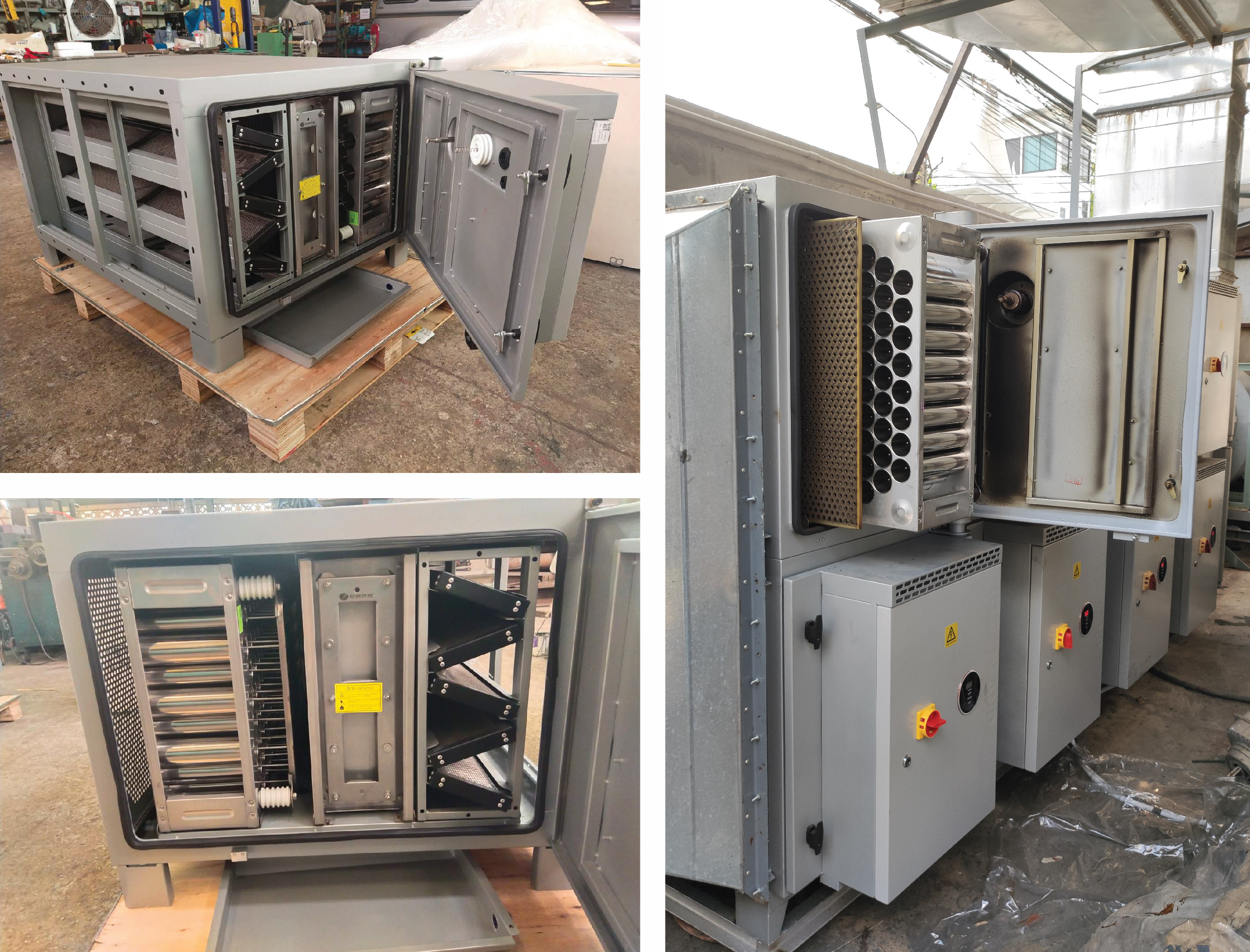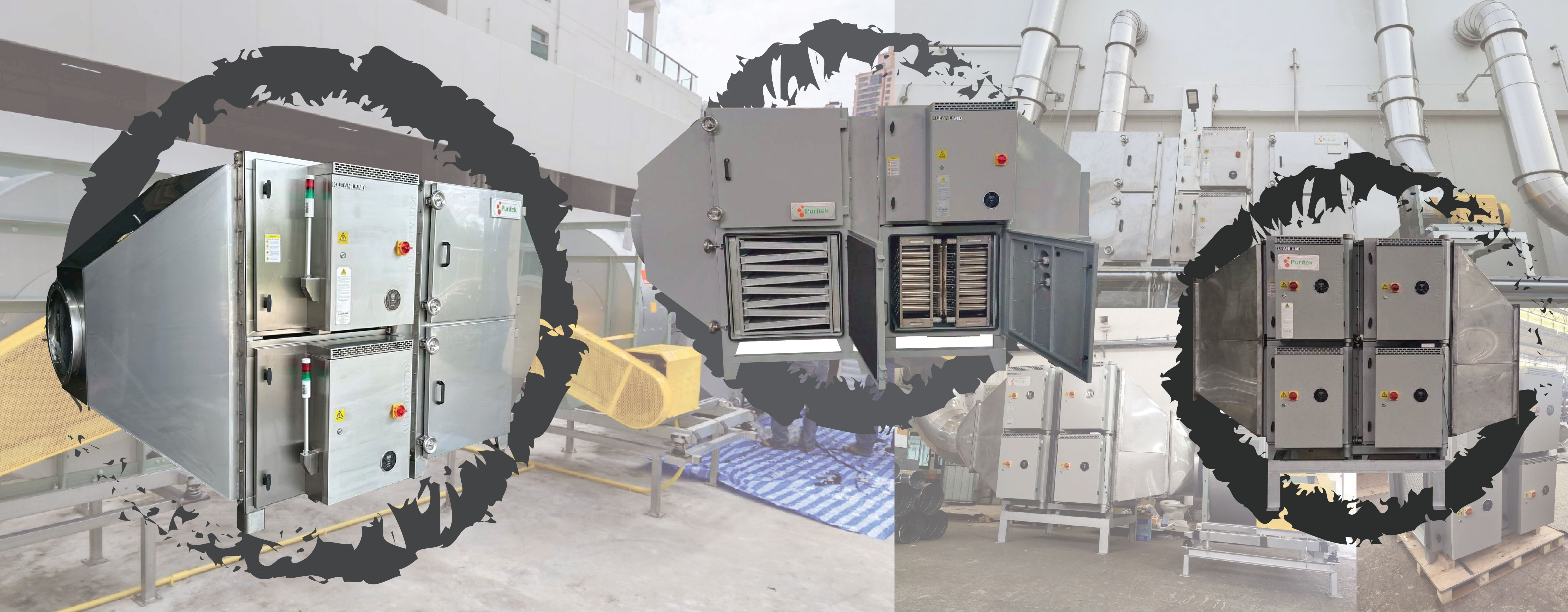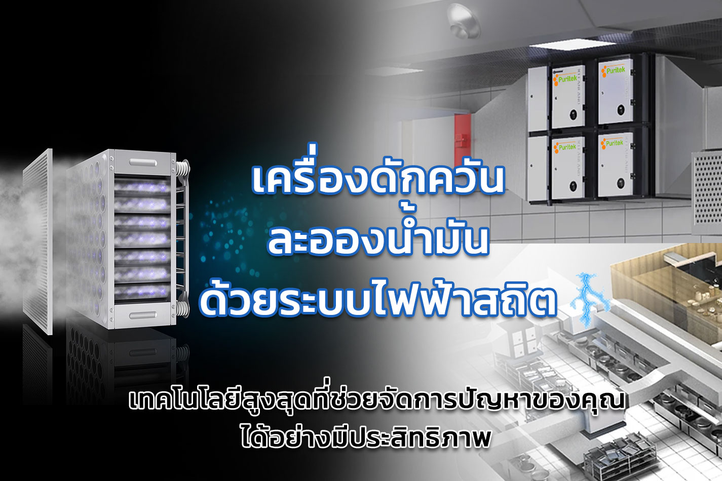 เทคโนโลยีกำจัดกลิ่น ควัน ไอน้ำมันด้วยระบบไฟฟ้าสถิต ใช้หลักการสร้างสนามไฟฟ้าแรงสูงมาจับฝุ่นละออง หรืออนุภาคขนาดเล็กในกระแสลมที่ไหลผ่าน กระตุ้นให้อนุภาคขนาดเล็กมีค่าความต่างศักย์สูง และอนุภาคเหล่านั้นจะเคลื่อนที่เข้าหาแผ่นเก็บ หรือ Collector cell ที่มีค่าความศักย์ต่ำกว่า เมื่อฝุ่นละอองเกาะสะสมใน Collector cell เพิ่มมากขึ้น สามารถทำความสะอาดโดยการถอดออกมาล้าง หากเป็นไอน้ำมัน จะรวมตัวเป็นของเหลวและไหลลงสู่ Drainage Outlet (รูระบายน้ำมันทิ้ง)